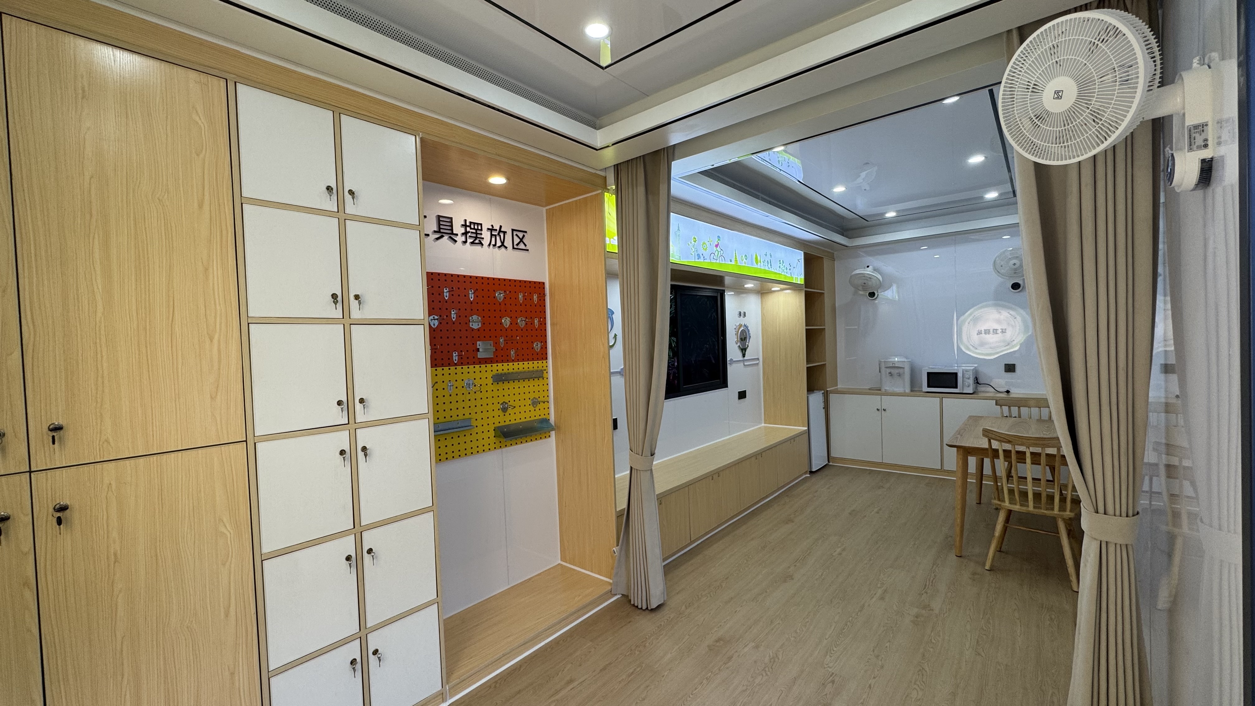 “这些驿站的‘智慧’之处在于引入了智能化管理系统,可以说是白云区环卫驿站中的顶配。”白云区城管局相关负责人介绍,驿站通过指纹解锁即可轻松进入,室内照明、电风扇、电动窗帘等均接入智慧中控系统,消防开关、监控设备24小时智能运行,绿色低碳的太阳能锂电池为室内设备提供源源不断的绿色能源,且24小时提供Wi-Fi、蓝牙连接。室外还有亮丽又醒目的发光灯带和发光字,为驿站添上亮眼的科技元素。