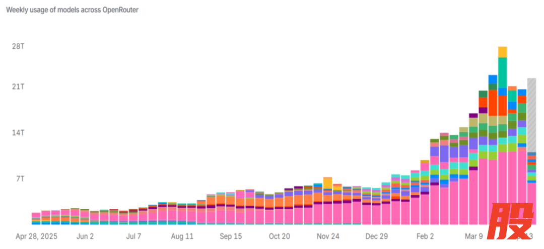 图表:近期OpenRouter的Token使用量出现指数级增长
