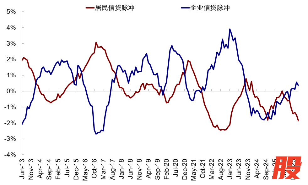 图表:私人脉冲结构上,居民信贷脉冲下行而企业信贷脉冲有所修复